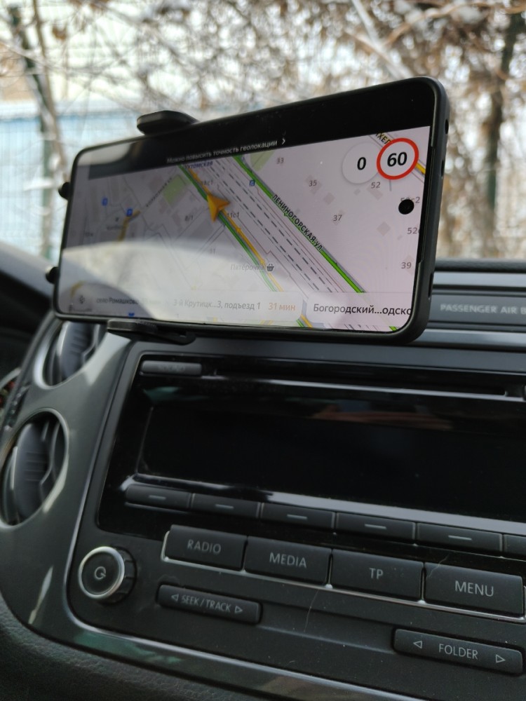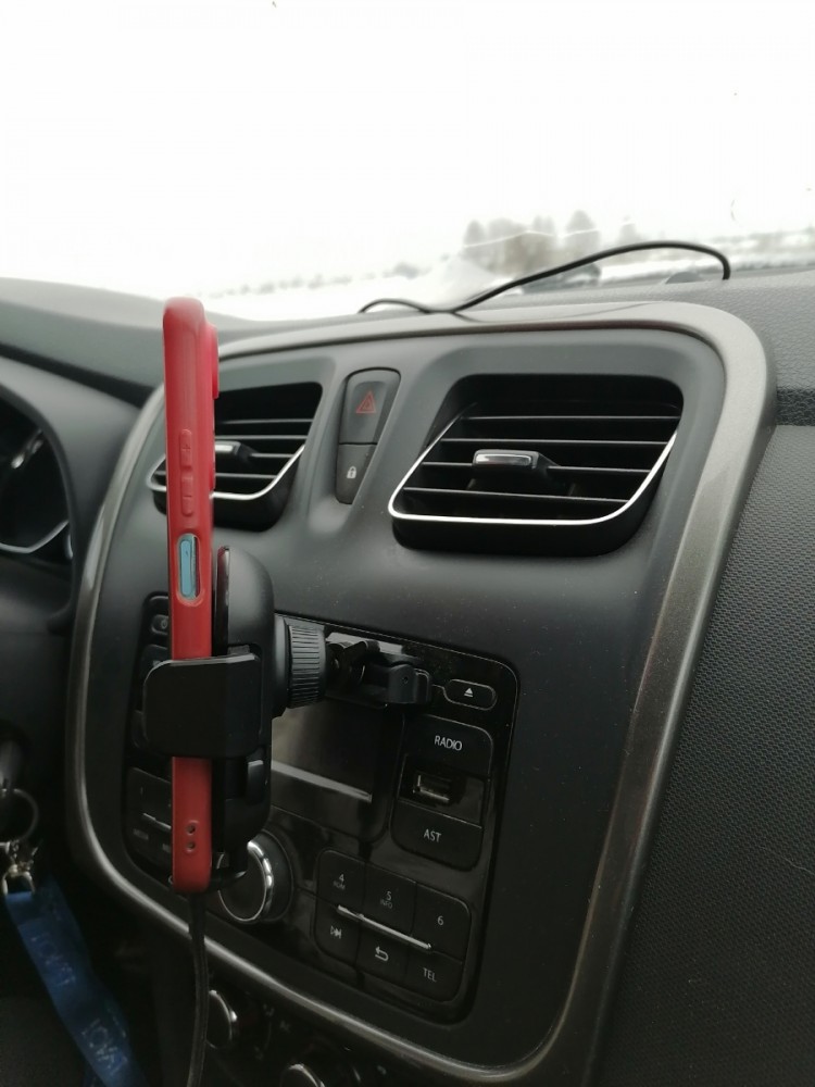Снизу у зажима есть опоры смартфона. Изначально они задвинуты в корпус держателя. Их надо вынуть и развернуть на 90 градусов. Нижние опоры совместно с зажимом с ребристыми вставками держат смартфон надежно даже на очень неровной дороге.