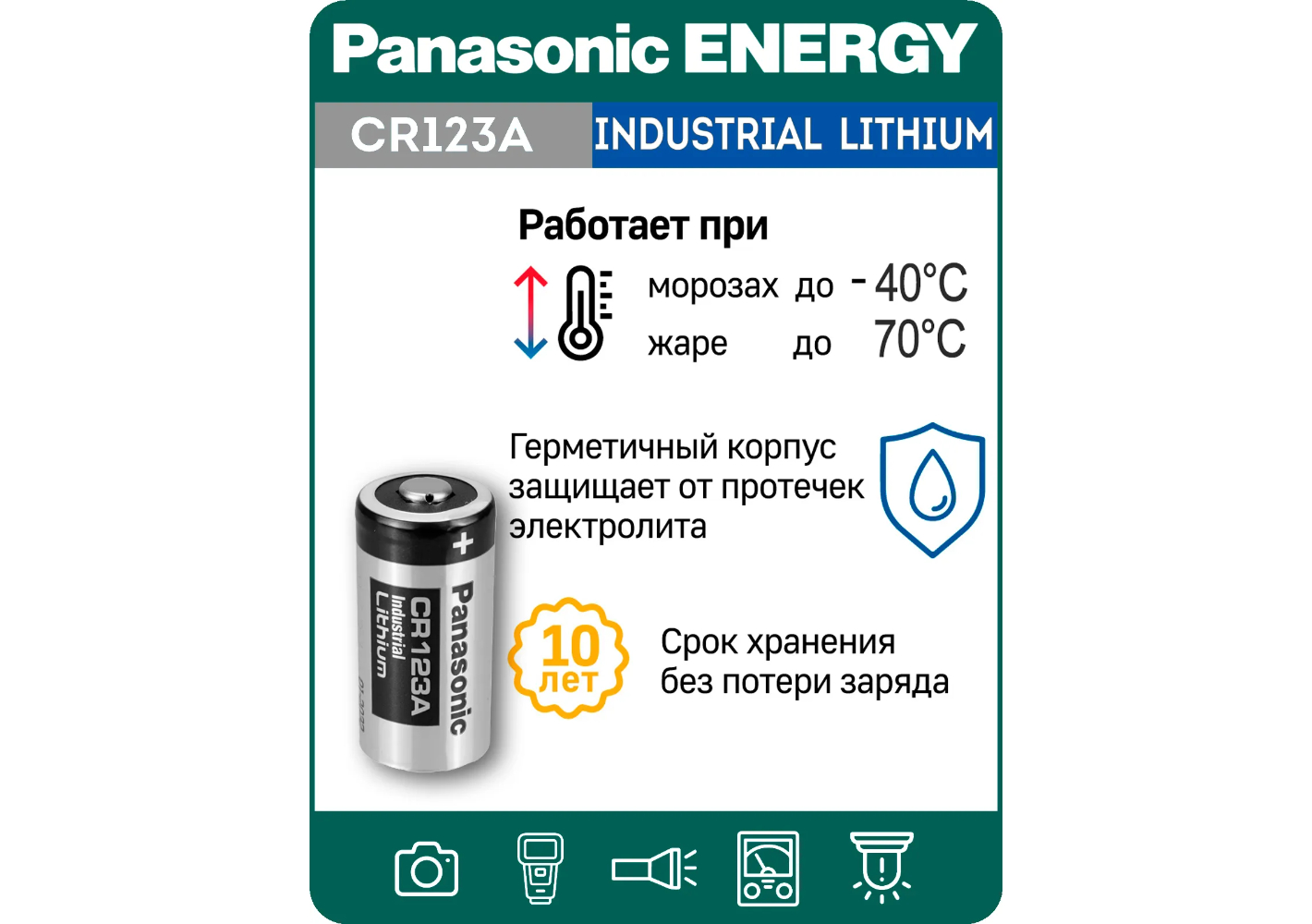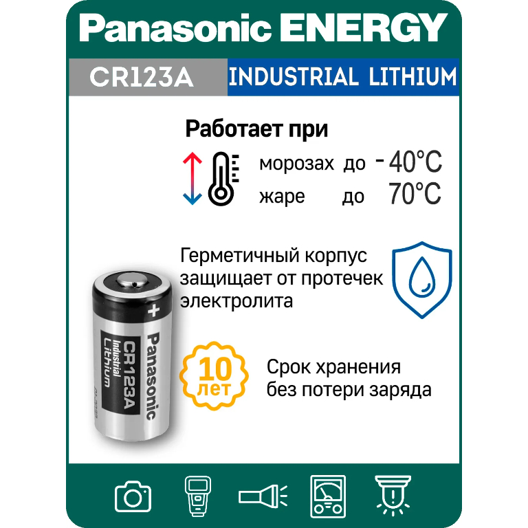 Литиевая батарейка Panasonic CR123A (5 шт) на 3 вольта отличается повышенной ёмкостью - до 1550 мА*ч. Такой резерв энергии гарантирует исправную работу камеры пока вы делаете идеальный снимок. Кроме того, Panasonic CR123A работает в диапазоне экстремальных температур от -20°С до +45°С, поэтому для фотосессии на открытом воздухе в любую погоду нет технических преград, только ваше желание