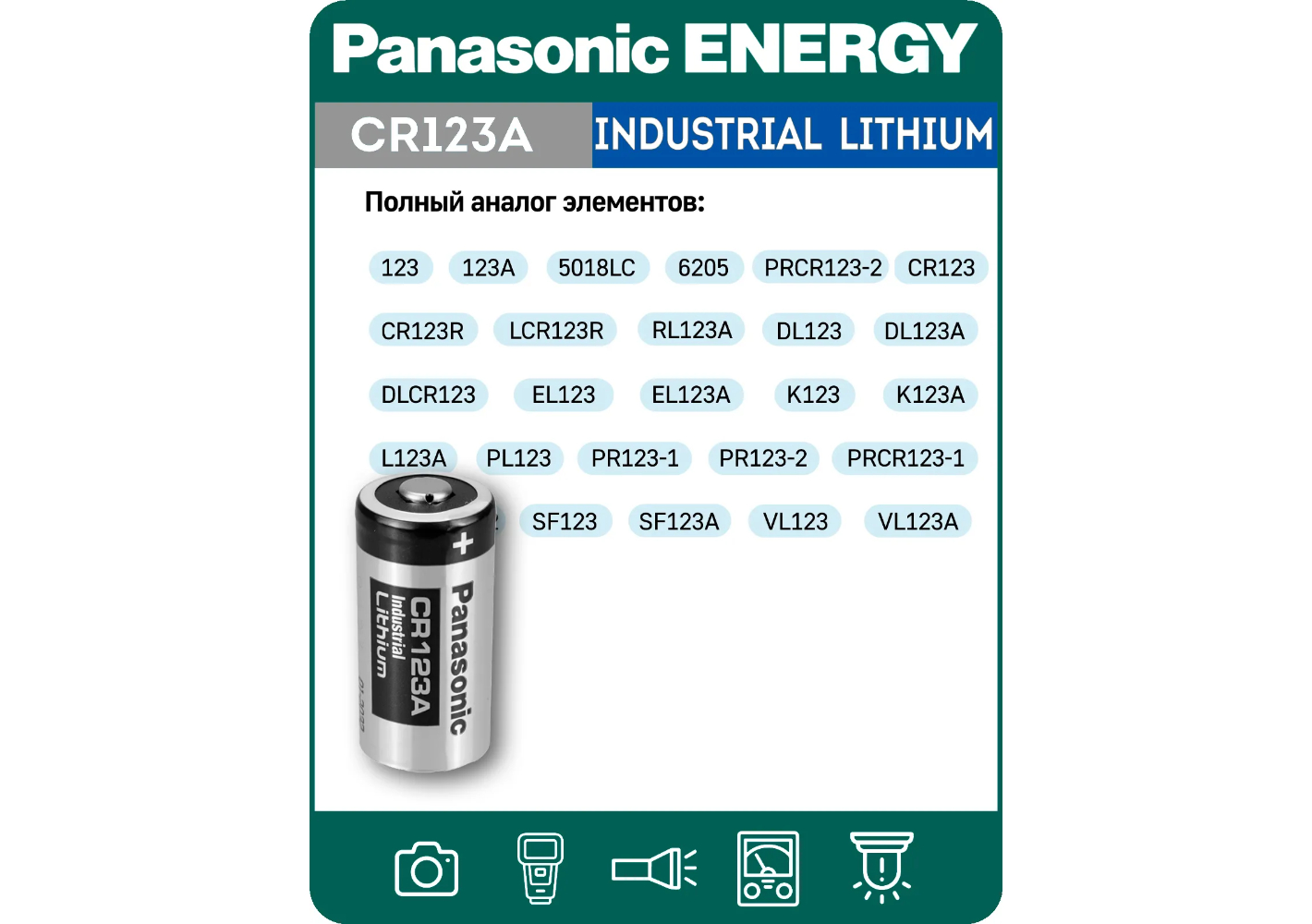 EL CR123AP, K123LA, CR17345, 123, 123A, CR123, CR123A, CR123R, CR17335, CR17345, DL123A, EL123AP, K123LA, L123A, SF123A, VL123A, 5018LC