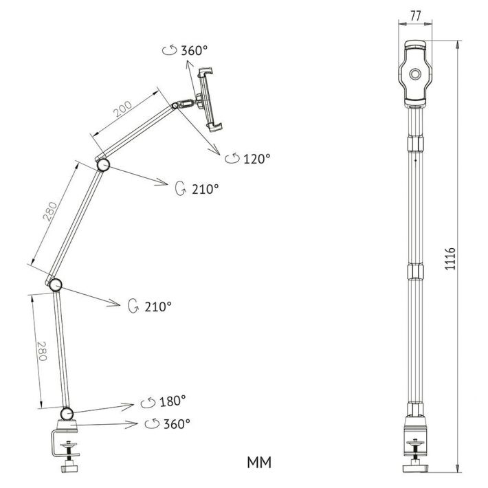 Настольную подставку можно установить на любую плоскую поверхность толщиной до 45 мм. Она крепится с помощью мощной металлической струбцины. Регулировать усилие вращения штанги на 360 гр. (вокруг своей оси), можно в основании держателя. Регулировка производится комплектным шестигранным ключом.